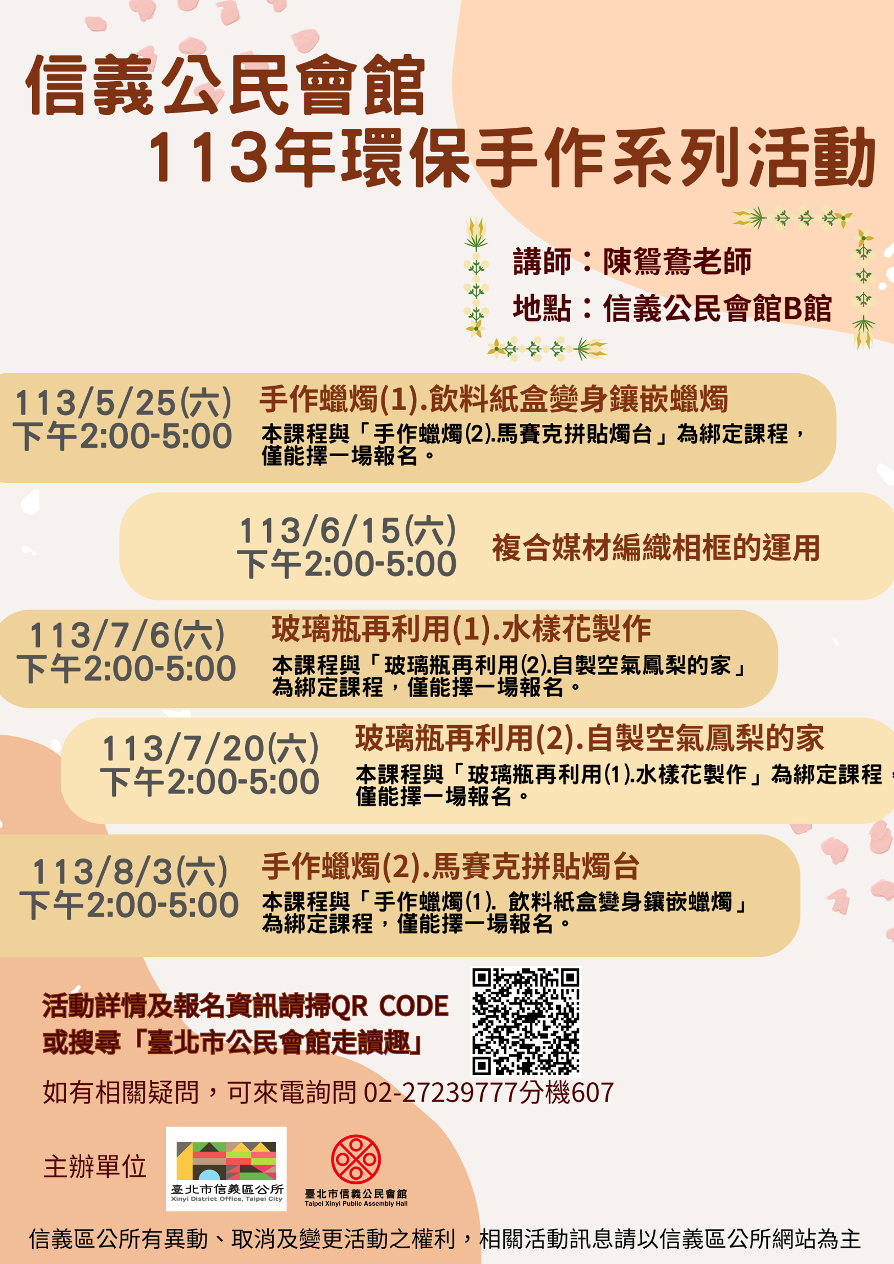 1.本課程為璃瓶再利用課程,為使更多民眾有參加活動之機會,本課程將與【113年信義公民會館環保手作系列課程】玻璃瓶再利用(2).自製空氣鳳梨的家 設定為綁定課程,民眾僅能擇一報名參加(即使報名本課程後因故未出席者,亦無法報名綁定課程)。
