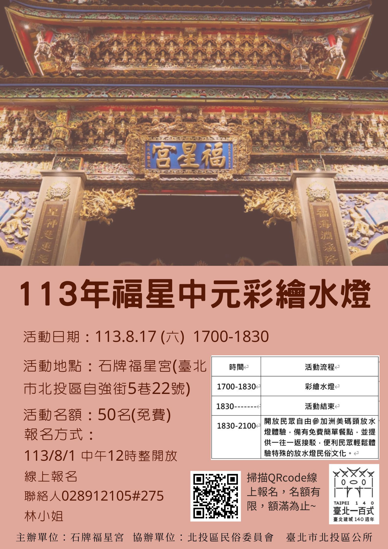 現場老師透過彩繪水燈活動,帶著大家認識、體驗傳統宗教文化,活動結束另開放自由參加洲美碼頭放水燈活動,福星宮備有免費簡單餐點,更提供有興趣的民眾一往一返接駁車,方便民眾體驗特殊放水燈文化活動。