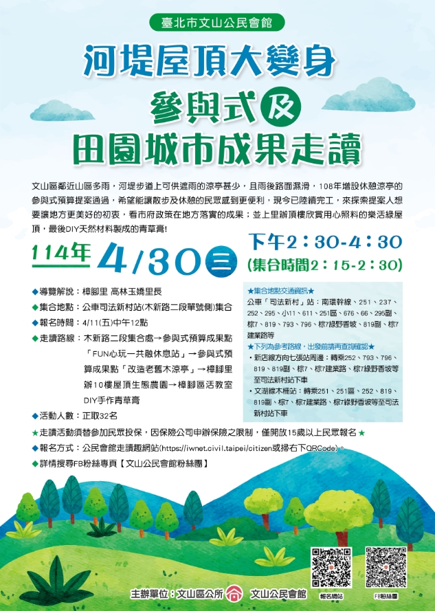 ★走讀活動皆會為每位參加民眾辦理保險,因保險公司申辦保險之限制,僅開放15歲以上民眾報名★