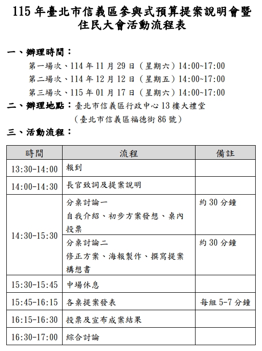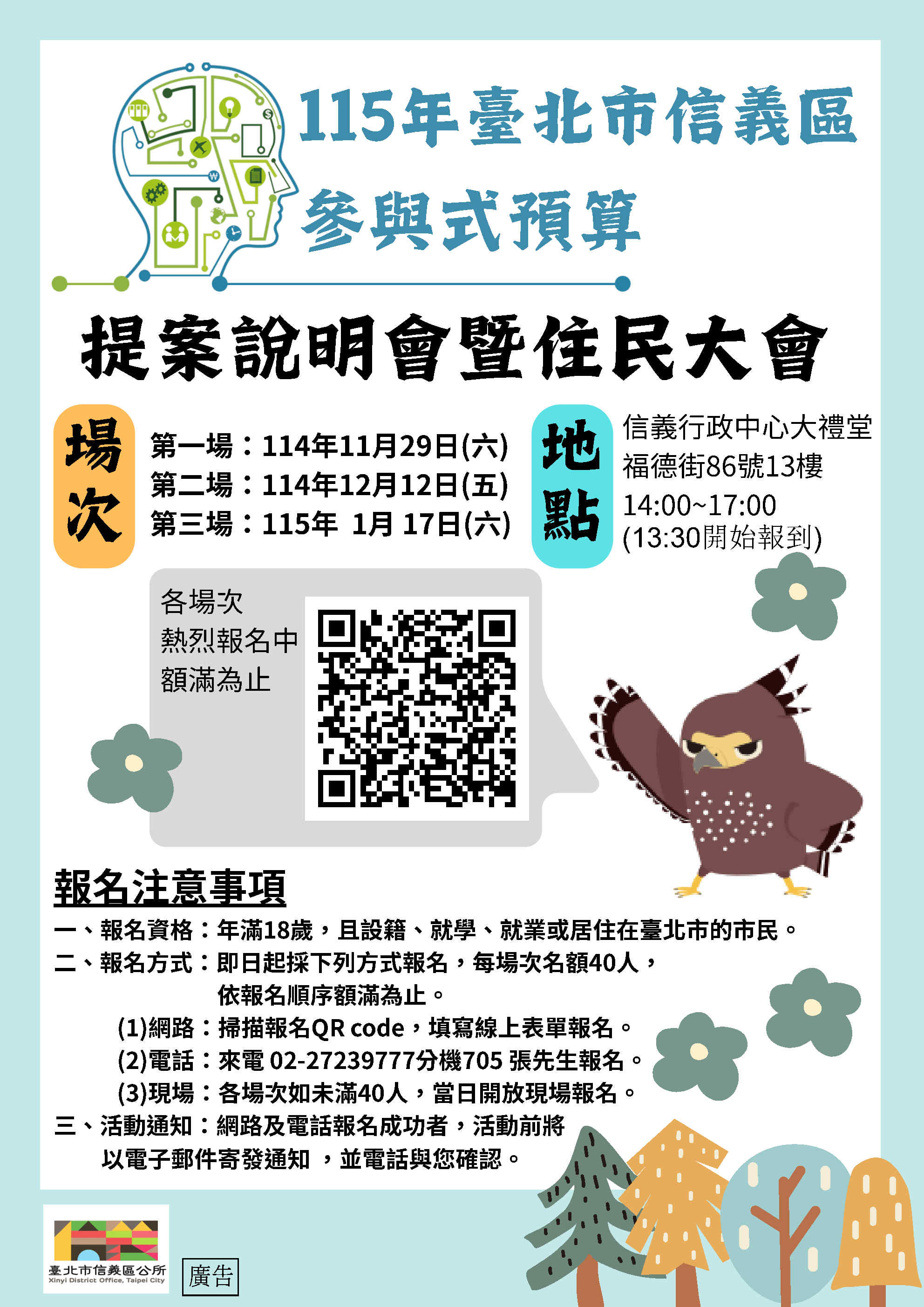 (1)報名資格:凡年滿18歲(走入校園計畫16歲),且設籍 、就學、就業或居住於臺北市信義區的市民朋友,都可以提案(擇一符合即可)。