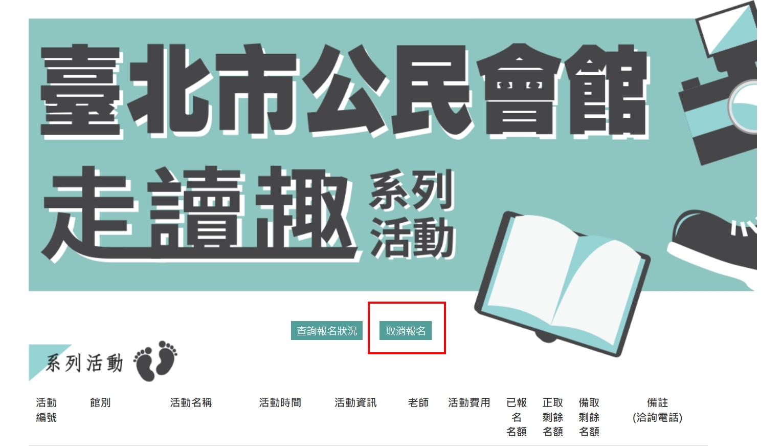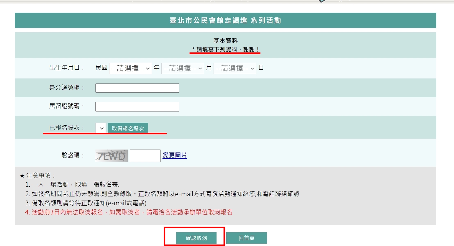 https://iwnet.civil.taipei/citizen)首頁大標題下方右邊"取消報名"之綠色方塊,進入後填寫基本資料及確認已報名場次後送出},以利釋放名額給其他人報名參加,恕不接受學員私下以換員方式參加。