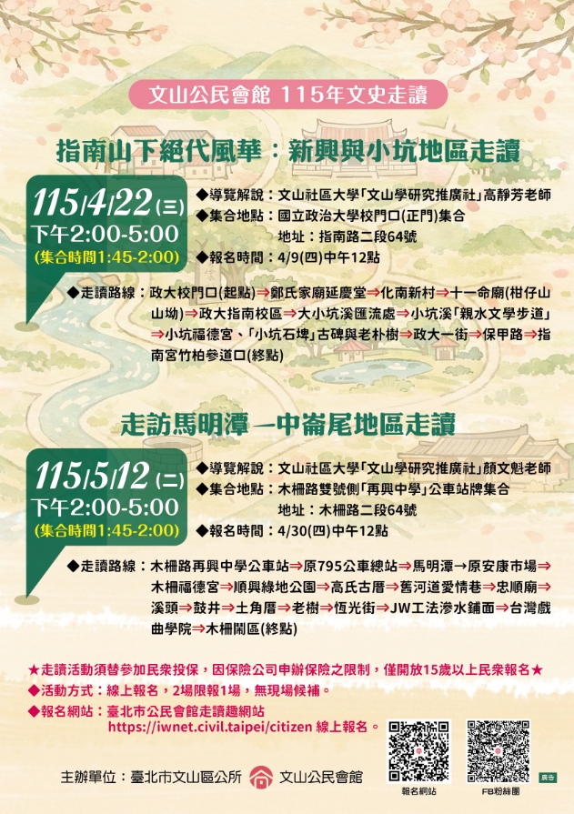 ★走讀活動皆會為每位參加民眾辦理保險,因保險公司申辦保險之限制,僅開放15歲以上民眾報名★
