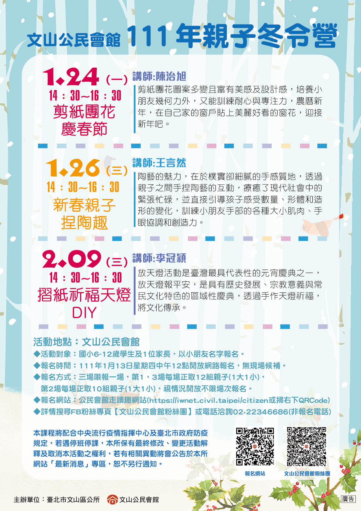 8.本課程將配合中央流行疫情指揮中心及臺北市政府防疫規定,若遇停班停課,本所保有最終修改、變更活動解釋及取消本活動之權利,若有相關異動將會公告於臉書文山公民會館粉絲團及本所網站之文山公民會館「最新消息」專區,恕不另行通知。